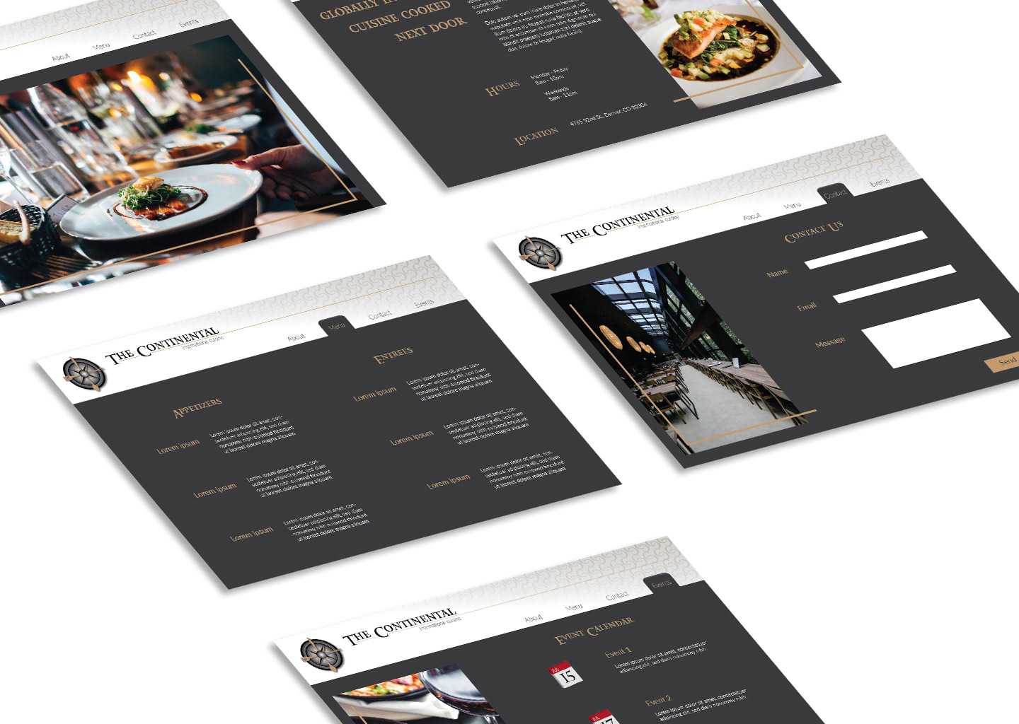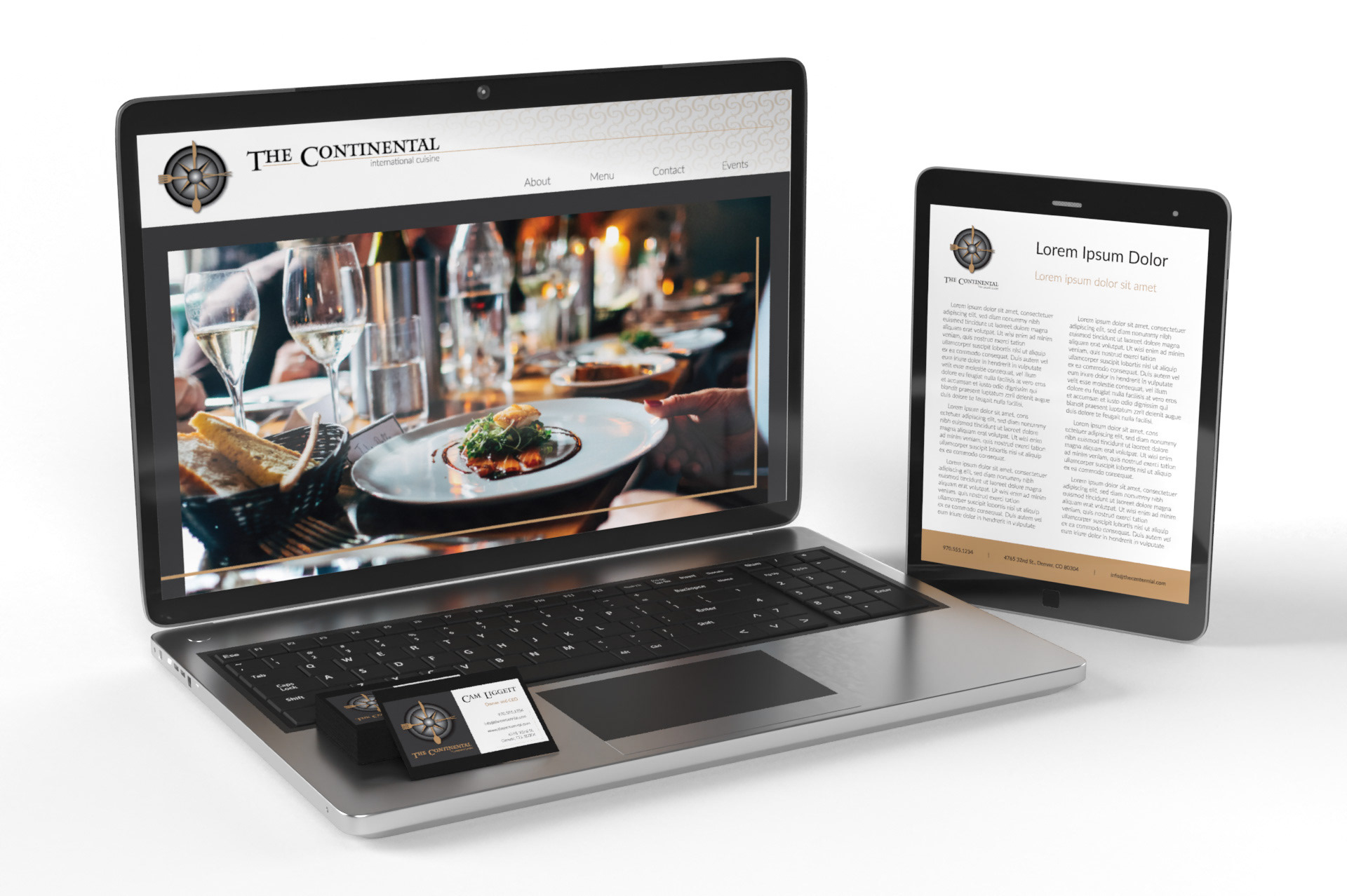 Brand identity kit for a concept restaurant named "The Continental." Website and logo designed in Adobe Illustrator with 3D scenes rendered in Adobe Dimension.